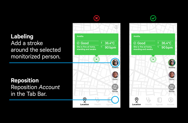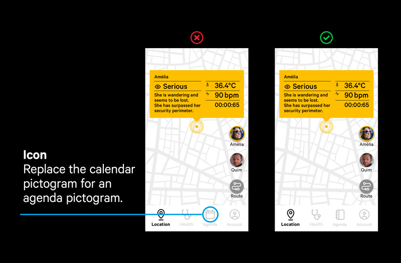 Quim decides to trust the system, close the message using the upper right little cross and keeps tracking her mother through the main map screen. In case her mother would be transported by a vehicle —an ambulance— the app will notify Quim and his sister Gemma about it.