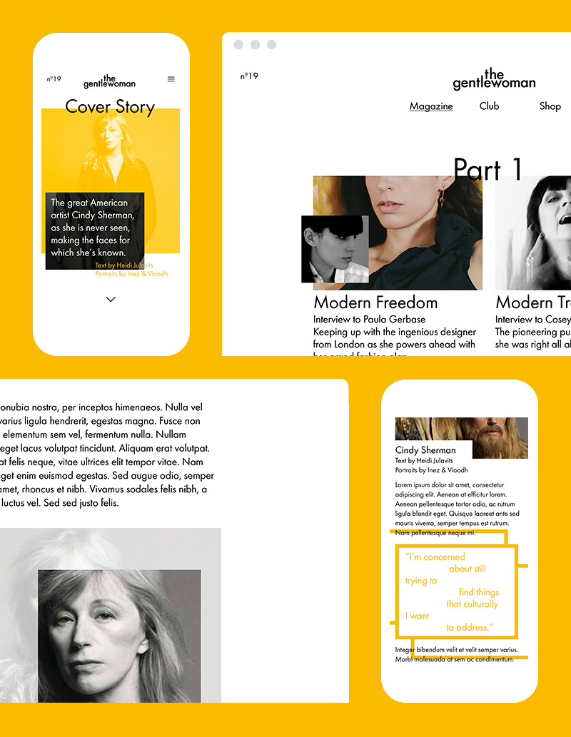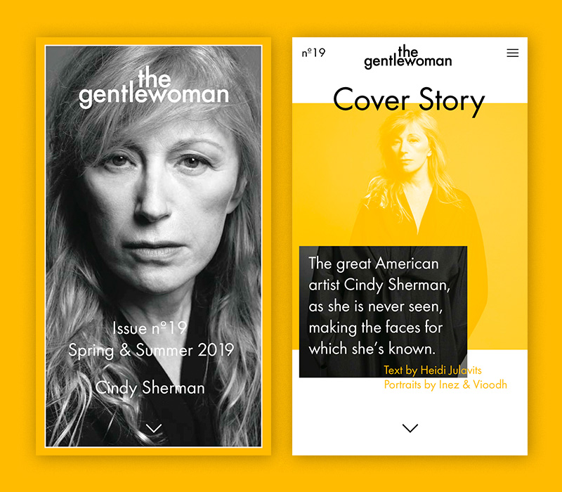 At the Cover Story page on mobile, shown below, the Multilayered Woman concept is graphically expressed by overlapping pictures, shapes and typography in a modern and consistent way.