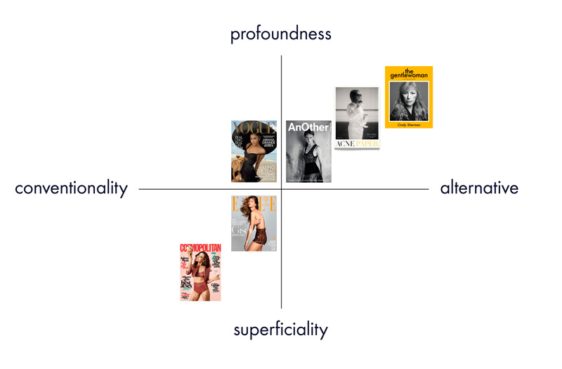 The Gentlewoman stands out for its qualitative literature and photography. Its design and content is alternative and profound as opposed to the conventionality and superficiality of other magazines.