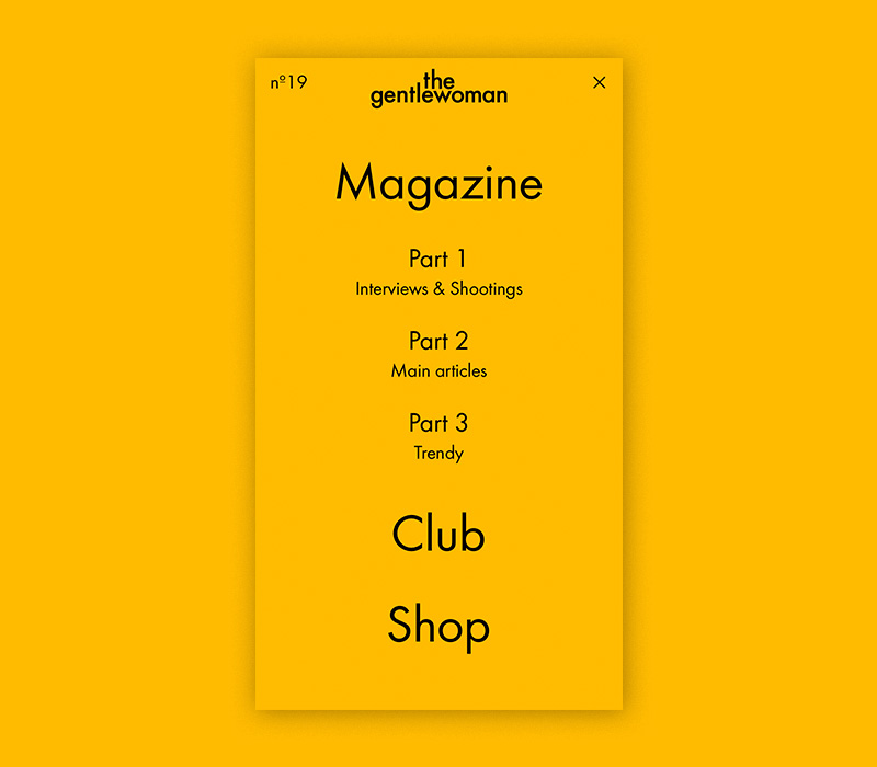 On the upper right corner of the mobile edition of the website, the reader is able to tab the hamburger menu and access the magazine's Summary —divided in three parts— the Shop and Club sections respectively.
