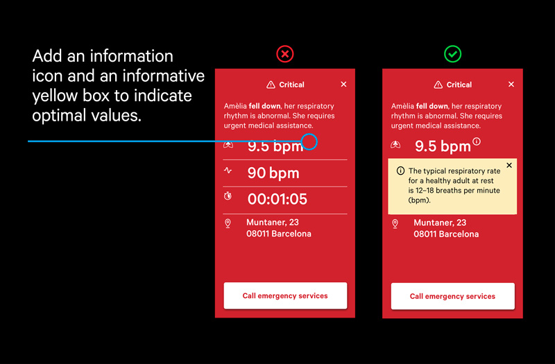 All of a sudden, he gets another warning. This is a Critical message —in red color— covering the whole screen and informing him that Amèlia fell down and her respiratory rhythm is abnormal. It suggests Quim to ask for urgent medical assistance. Their respiratory rhythm data is shown on the top but Quim has no clue what's the normal respiratory rhythm of an adult, so he quickly tabs on the information sign next to the respiratory rhythm value. The information he gets helps him to answer his question.