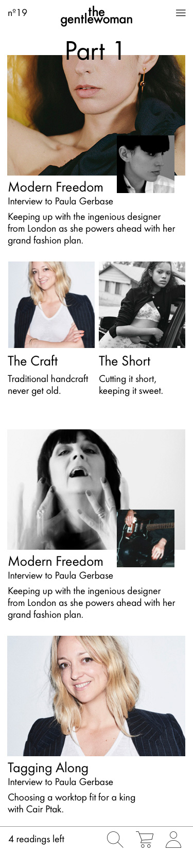 By tabbing on Part 1, the reader have access to the magazine's first section that showcases some secondary Interviews & Shootings. In this example, taking in consideration that the reader is browsing with no subscription and has already read the Cover Story article, the tool bar states that the user has only 4 readings left free of charge before having to subscribe in order to keep reading the magazine.