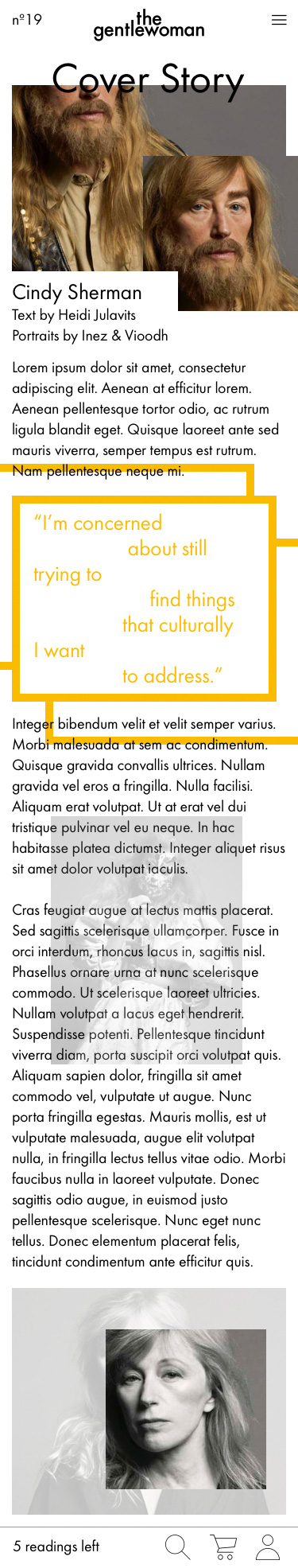 At the Cover Story page on mobile, shown below, the Multilayered Woman concept is graphically expressed by overlapping pictures, shapes and typography in a modern and consistent way.
